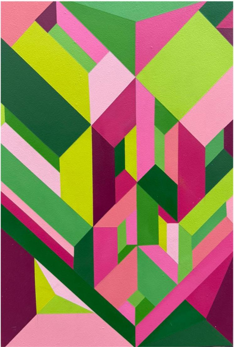 Por meio da cor e do equilíbrio das formas, Kaur reconstrói linguagens, abrindo portais visuais que convidam o olhar a atravessar a superfície e adentrar um universo próprio.