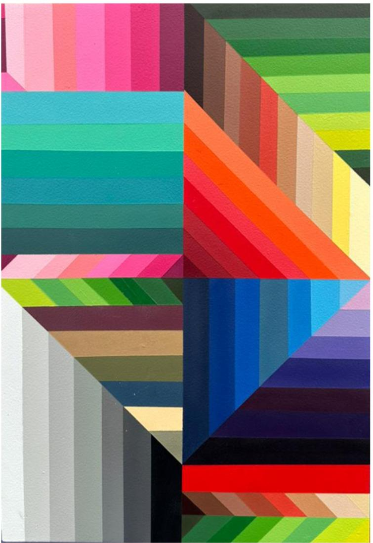 Por meio da cor e do equilíbrio das formas, Kaur reconstrói linguagens, abrindo portais visuais que convidam o olhar a atravessar a superfície e adentrar um universo próprio.